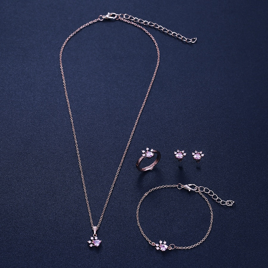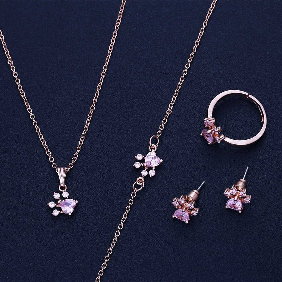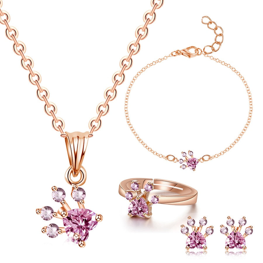 New Fashion Cat Bear Dog Paw Ring for Women Jewelry Sets White CZ Stone Silver Gold Rings Necklace Bracelet Earring Set